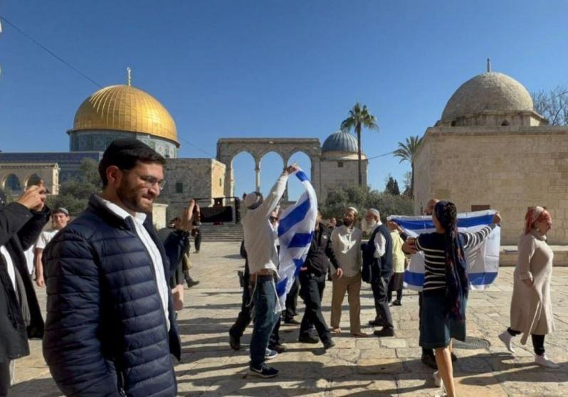رفع مستوطنون اليوم الإثنين، الأعلام الإسرائيلية، في المسجد الأقصى المبارك، وأدوا الصلوات الجماعية العلنية فيه.