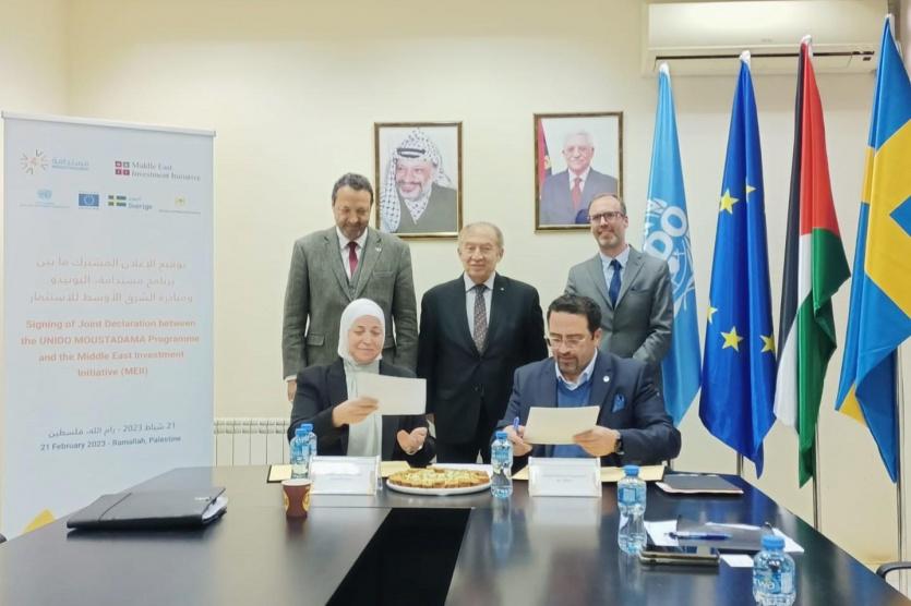 تحت رعاية وزير الاقتصاد الوطني خالد عسيلي، وقّع برنامج "مستدامة" التابع لمنظمة الأمم المتحدة للتنمية الصناعية (اليونيدو) ومبادرة الشرق الأوسط للاستثمار(MEII) ، اليوم الثلاثاء، إعلانا مشتركا لتسهيل وصول المنشآت الصناعية الفلسطينية الصغيرة والمتوسطة إلى التمويل.
