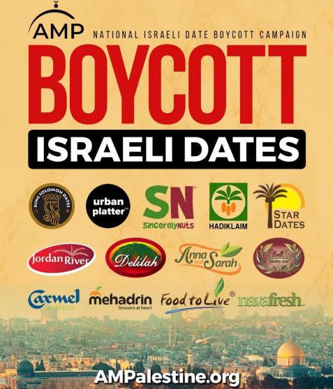 دعت منظمة (The American Muslims for Palestine (AMP) ) أبناء الجاليات العربية والفلسطينية بعدم الشراء او التعامل مع التمور الاسرائيلية التي تباع في الأسواق الأميركية مع حلول شهر رمضان الفضيل، والتي تسوّق معظمها على أنها منتجات فلسطينية .