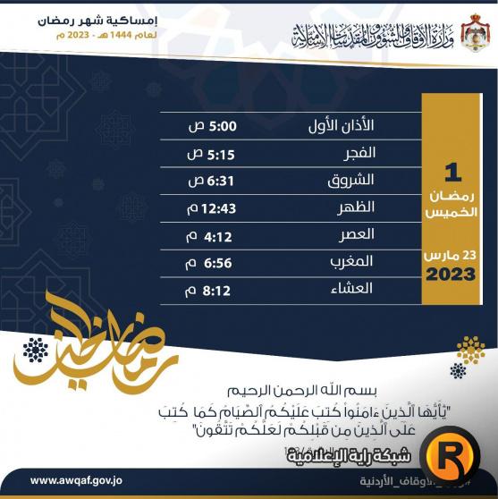 إمساكية رمضان 2023 في الأردن، نشرت وزارة الأوقاف والشؤون والمقدسات الإسلامية، مواقيت الصلاة والسحور والإفطار في اليوم الأول من الشهر الفضيل الذي يبدأ أول أيامه بالمملكة اعتبارا من اليوم الخميس 23 مارس.