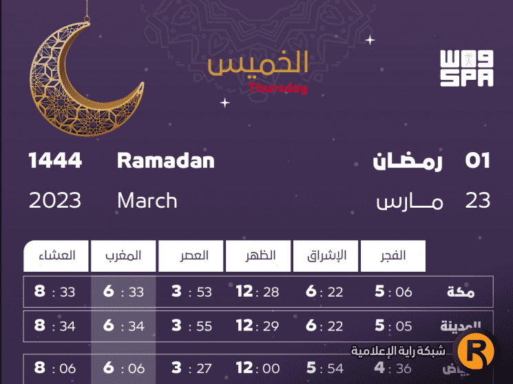 إمساكية رمضان 1444 - 2023 في السعودية، حيث نشرت وكالة الأنباء الرسمية في المملكة، مواقيت الصلاة في اليوم الاول من الشهر الفضيل الذي يصادف اليوم الخميس 23 مارس/ آذار في البلاد ومعظم البلدان الإسلامية.