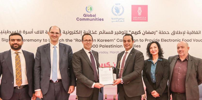 قدم بنك فلسطين تبرعاً بقيمة 500 ألف دولار أمريكي، لدعم 5000 أسرة متعففة في كافة محافظات الوطن، بمناسبة حلول شهر رمضان المبارك، وذلك من خلال توفير بطاقات إلكترونية لشراء مواد غذائية عبر برنامج الأغذية العالمي التابع للأمم المتحدة (WFP)، ومؤسسة مجتمعات عالمية"Global community"، باستخدام أنظمة الدفع الإلكتروني، ومراكز التسديد المعتمدة لدى شركة بال بـ "PalPay".