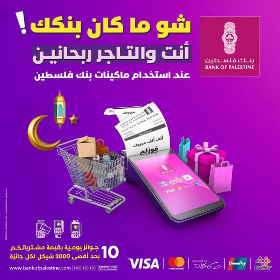أطلق بنك فلسطين حملة جديدة لتشجيع الدفع عبر ماكنات البيع التابعة لبنك فلسطين تحت شعار (شو ما كان بنكك.. إنتو والتاجر ربحانين). وتستهدف الحملة عملاء بنك فلسطين وعملاء البنوك المحلية والأجنبية الذين يستخدمون بطاقاتهم البلاستيكية (البنكية)، بالإضافة الى التجار المستخدمين لماكينات بنك فلسطين. حيث تتيح الحملة الجديدة، فرص الربح بـ 10 جوائز يومية بقيمة المشتريات في مختلف المحافظات والمدن الفلسطينية.