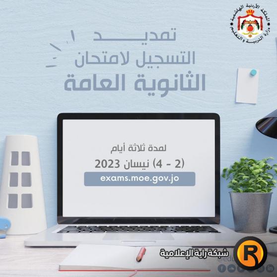 وقالت الوزارة عبر موقع التواصل الاجتماعي فيسبوك: "الطلبة الأعزاء،.. تقرَّر تمديد فترة التسجيل لامتحان الثانوية العامة 2023 لمدة (ثلاثة أيام) بدءًا من صباح يوم (الأحد) 2 /4 /2023، ولغاية مساء (الثلاثاء) 4/ 4/ 2023".