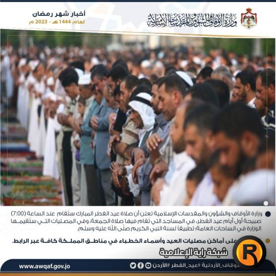 وبحسب الوزارة، فإن وقت صلاة العيد في الأردن 2023 الساعة السابعة صباح أول أيام عيد الفطر المبارك، وذلك في المساجد التي تقام فيها صلاة الجمعة، وفي المصليات التي ستقيمها الوزارة في الساحات العامة تطبيقا لسنة النبي الكريم صلى الله عليه وسلم.