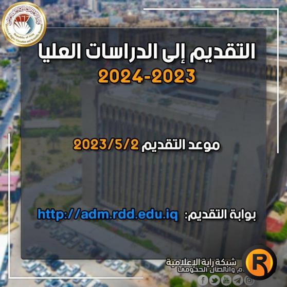 أعلنت وزارة التعليم العالي والبحث العلمي بدء إجراءات التقديم الإلكتروني إلى الدراسات العليا (http://adm.rdd.edu.iq) يوم غد الثلاثاء الموافق 2023/5/2 ولغاية 2023/6/1 على وفق توقيتات التقديم والقبول للعام الدراسي 2023/2022.