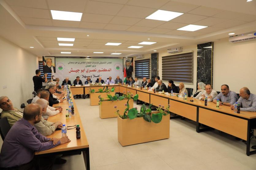 استقبل الاتحاد العام للصناعات الفلسطينية والمجلس التنسيقي لمؤسسات القطاع الخاص وزير العمل د نصري أبو جيش، السيد بلال دوابة وكيل مساعد رئيس هيئة العمل الوطني ،والسيد طارق صقر الوكيل المساعد وزارة الزراعة، والسيد اياد نصر وكيل وزارة الشؤون المدنية، وذلك بمقر الاتحاد العام للصناعات الفلسطينية، وكان في استقبال الوزير أعضاء المجلس التنسيقي وعلى رأسهم أمين سر المجلس السيد أسامة النعسان ورؤساء مؤسسات القطاع الخاص ورؤساء الاتحادات التخصصية والسيدة أمل الوزير رئيس المجلس التاسيسي للسيدات الصانعات بلاضافة الى عدد من الشخصيات الاعتبارية .