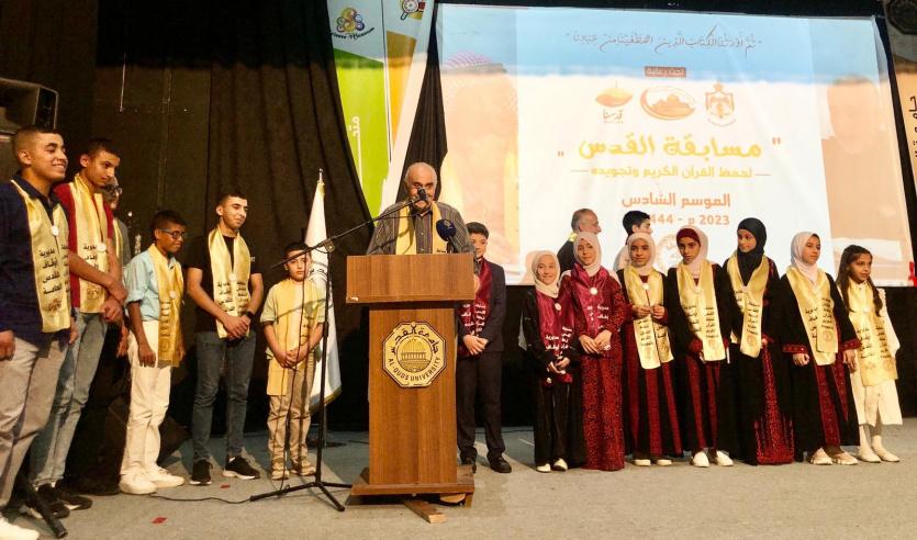 القدس – أقيم ظهر اليوم الاثنين حفل إختتام "مسابقة القدس" لحفظ القرآن الكريم وتجويده – الموسم السادس  تحت رعاية مؤسسة قدسنا الوقفية وإدارة الأوقاف العامة الإسلامية في القدس وذلك في جامعة القدس ابو ديس بحضور رئيس مجلس إدارة صندوق ووقفية القدس منيب رشيد المصري ونائب رئيس جامعة القدس الدكتور حسن دويك نيابة عن رئيس الجامعة د. عماد ابو كشك ونائب مدير عام أوقاف القدس مدير عام المسابقة الشيخ ناجح بكيرات وحشد من المتسابقين وذويهم.