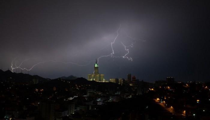 وفيما كان المصلون يطوفون حول الكعبة في المسجد الحرام، عند نحو الساعة السادسة مساءً بالتوقيت المحليّ، ضربت صاعقة من البرق فندق "فيرمونت مكة" في برج الساعة الملكي الشهير، مضيئة سماء العاصمة المقدسة.