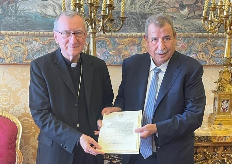 سلم عضو اللجنة التنفيذية لمنظمة التحرير الفلسطينية، رئيس اللجنة الرئاسية العليا لمتابعة شؤون الكنائس في فلسطين رمزي خوري، اليوم الجمعة، أمين سر حاضرة الفاتيكان الكاردينال بيترو بارولين، رسالة من رئيس دولة فلسطين محمود عباس إلى الحبر الأعظم البابا فرنسيس، وذلك خلال لقائهما في الفاتيكان.