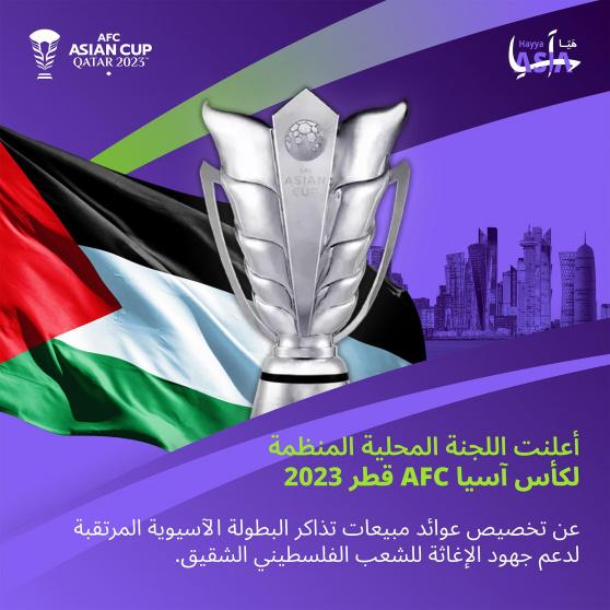أعلنت اللجنة المنظمة المحلية لبطولة كأس آسيا AFC قطر 2023 عن تخصيص عوائد مبيعات تذاكر البطولة الآسيوية المرتقبة لدعم جهود الإغاثة للشعب الفلسطيني الشقيق، الذي يمر في أزمة حرجة تستوجب من الجميع المساندة وتقديم مختلف أنواع الدعم اللازمة.