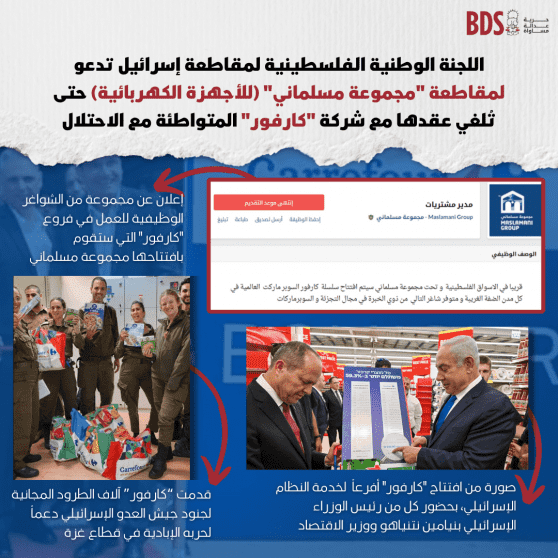 في هذه الأوقات الصعبة، التي يواصل فيها الاحتلال الإسرائيلي حربه الإبادية على غزة المحتلة والمحاصرة، وتطهيره العرقي بحق أبناء شعبنا في كل فلسطين التاريخية، ولاحقًا لمناشدتنا العلنية لمجموعة مسلماني بالعدول عن توقيع أي اتفاقية مع شركة "كارفور" الفرنسية المتورطة في دعم الاحتلال الإسرائيلي، تدعو اللجنة الوطنية الفلسطينية لمقاطعة إسرائيل، أوسع تحالف في المجتمع الفلسطيني وقيادة حركة المقاطعة (BDS) أبناء وبنات شعبنا الفلسطيني، وكل المؤسسات والهيئات المحلية والمدارس والجامعات والشركات الفلسطينية، لمقاطعة "مجموعة مسلماني" المُختصة في بيع الأجهزة الكهربائية. كما تدعو إلى إلغاء أي تعاقد مسبق مع الشركة و/أو عدم تجديده، حتى تُلغي عقدها مع شركة "كارفور" العالمية، وتُنهي أي تعاقد شفهي أو خطي يُفضي إلى تسهيل تسويق منتجات "كارفور" في الأراضي الفلسطينية المحتلة، بما فيها القدس، وذلك بسبب تواطؤ الشركة الفرنسية في الانتهاكات الإسرائيلية الجسيمة لحقوق شعبنا الفلسطيني بموجب القانون الدولي.