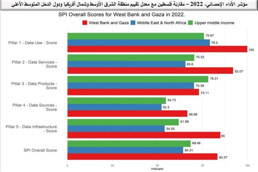 حصلت دولة فلسطين ممثلة بالجهاز المركزي للإحصاء الفلسطيني على المرتبة الأولى على مستوى منطقة الشرق الأوسط وشمال أفريقيا في مؤشر الأداء الإحصائي SPI، وذلك ضمن تقييم البنك الدولي للنظم الإحصائية الوطنية للعام 2022، حيث حصلت على تقييم 83.4% في المؤشر الكلي، والذي يتكون من خمس ركائز رئيسية ضمن 22 بُعد؛