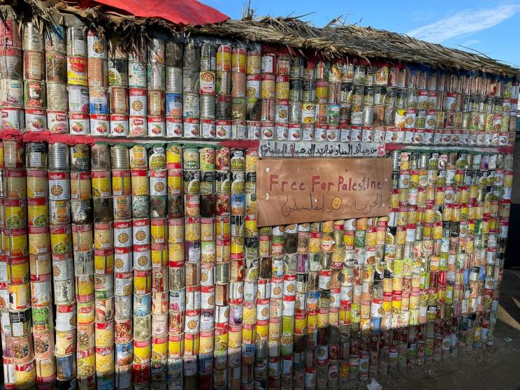 معلبات فارغة كانت طعامًا أساسيًا للنازحين في مدينة دير البلح وسط قطاع غزة، شكلها مبادرون على هيئة خيمة تعبيرًا عن مسكنهم الأساسي الذي يأويهم الآن بعد نزوحهم قسرًا من منازلهم.