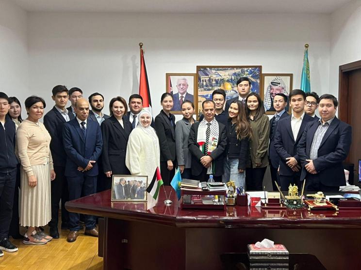 وقال أبو زيد أمام نخبة طلاب العلاقات الدولية والقانون الدولي في كازاخستان، يصادف اليوم مرور أكثر من 200 يوماً على العدوان الإسرائيلي على قطاع غزة وكافة الأراضي الفلسطينية المحتلة بما فيها القدس الشرقية ، حيث بلغ عدد الشهداء أكثر من 34 ألف فلسطيني بالإضافة إلى ما يقارب الـ 10 ألآف فلسطيني مفقود تحت الأنقاض وعشرات الألآف من المصابين الفلسطينيين وأن 70 % من الضحايا هم نساء وأطفال ، هذا بالإضافة إلى المئات من الشهداء في محافظات الضفة الغربية ومدينة القدس ، كما قام الإحتلال الإسرائيلي ومنذ أن بدأ عدوانه الغاشم على الشعب الفلسطيني بتدمير عشرات الألآف من المباني السكنية ومئات المؤسسات الحكومية والتعليمية والصحية وتهجير مايقارب من 1.7 مليون فلسطيني من منازلهم وشنه حرب إبادة ضد الشعب الفلسطيني في قطاع غزة غير مكترس لكافة القوانين الدولية والإنسانية.