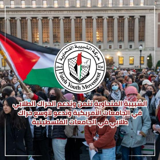 وأدانت حركة الشبيبة الفتحاوية الاعتداءات التي مورست بحق الطلبة المعتصمين والأساتذة في الجامعات الأميركية والتعدي على حقهم في التعبير عن الرأي والتجمع، وكيل الاتهامات الباطلة لهم تحت مسمى وفزاعة "معاداة السامية"، واعتقال عدد من الطلبة والتعامل بعنف مفرط معهم من قبل عناصر الشرطة والمناهضين لهذا الحراك التاريخي، ورفض كافة الإجراءات العقابية وقرارات الفصل التي اتخذت بحق عدد من الطلبة والطالبات، والأساتذة، بما يتعارض مع المبادئ والقيم الديموقراطية التي ترفعها الولايات المتحدة شعارا لها منذ نشأتها".