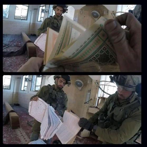 أظهرت مشاهد صورتها كاميرات جنود إسرائيليين ومسيّرات تابعة للاحتلال انتهاكات بحق المساجد في قطاع غزة، شملت إحراق نسخ من المصحف الشريف.