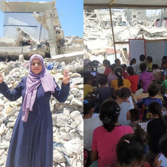 فوق ركام منزلها.. معلّمة تقدم التعليم والترفيه لأطفال غزة