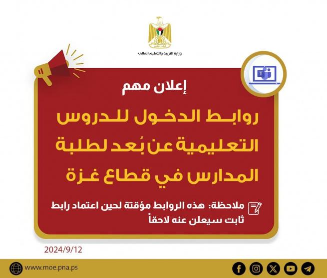 أعلنت وزارة التربية والتعليم الفلسطينية، عن روابط الدخول للدروس التعليمية للتعليم عن بعد لطلبة المدارس في قطاع غزة. بالتزامن مع عدوان الاحتلال الإسرائيلي المتواصل منذ أكثر من 11 شهرًا.