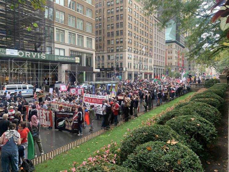 تظاهر آلاف النشطاء وأعضاء المنظمات الحقوقية والانسانية وأبناء الجاليات الفلسطينية والعربية والاسلامية، أمام مقر إقامة رئيس وزراء حكومة الاحتلال بنيامين نتنياهو، في مدينة نيويورك الأميركية، قبيل خطابه المقرر، اليوم الجمعة، في الجمعية العامة للأمم المتحدة، احتجاجا على جرائم الاحتلال المستمرة بحق شعبنا الفلسطيني، وما يحدث منذ أيام في لبنان.