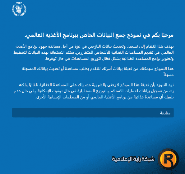 وحين الدخول على الموقع المرفق يظهر لك شاشة زرقاء اللون في البداية تكتب: "مرحبًا بكم في نموذج جمع البيانات الخاص ببرنامج الأغذية العالمي".