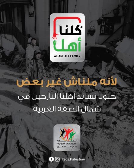 في ظل الهجمة الشرسة والخطط الانتقامية التي يمارسها الاحتلال بحق أهالي محافظات شمال الضفة الغربية، ووسط تزايد الاحتياجات الأساسية للنازحين الذين أجبروا على ترك منازلهم وحاجياتهم بشكل طارئ، خاصة في مخيمات جنين وطولكرم وبلدة طمون، أطلق تحالف المؤسسات الشبابية في فلسطين حملة "كُلنا أهل" لتعزيز التكافل المجتمعي وتقديم الدعم العاجل للأسر المتضررة.