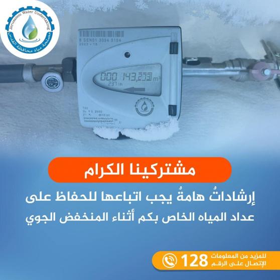 وفي حالة حدوث أي انقطاع مفاجئ في المياه، نصحت المصلحة بتخزين كميات كافية من المياه قبل بدء الانجماد من خلال ملء عدة جالونات، وذلك لضمان توافر المياه في حال حدوث أي طارئ.