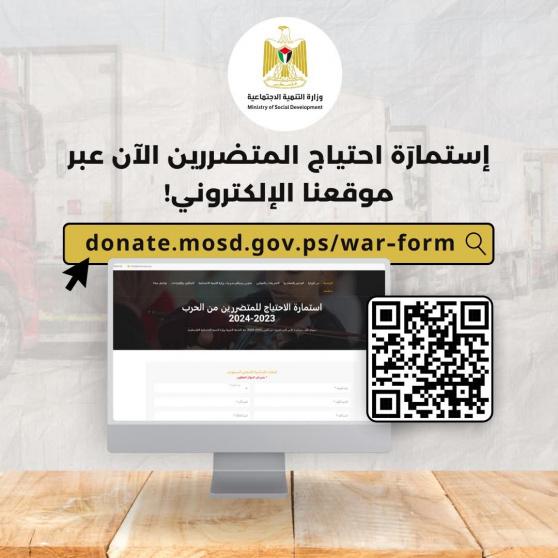 وقالت وزارة التنمية: "استكمالًا لجهود وزارة التنمية الاجتماعية في جمع المعلومات الخاصة بالمتضررين جراء الحرب على قطاع غزة وكذلك المتضررين في الضفة الغربية، نود إعلامكم أنه أصبحت استمارة الاحتياج للمتضررين الآن عبر موقعنا الإلكتروني".