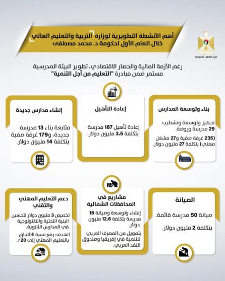 استعرضت وزارة التربية والتعليم أبرز أنشطتها التطويرية خلال العام الأول من تولي حكومة محمد مصطفى، التي شملت تنفيذ سلسلة مشاريع وتدخلات تطويرية هدفت إلى تحسين البنية التحتية للتعليم، وتوسيع نطاق الوصول إلى بيئة مدرسية آمنة ومتطورة، وذلك ضمن مبادرة "التعليم من أجل التنمية"، التي نفذتها في مختلف المحافظات، رغم الأزمة المالية الخانقة والحصار الاقتصادي الذي يفرضه الاحتلال.