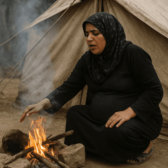 تتلمس بطنها المنتفخة، وتقول بصوت خافت يكاد يخنقه الدخان: "أنا بالشهر السادس، وبدل ما أرتاح، بختنق بالنار طول اليوم. صدري مجروح".