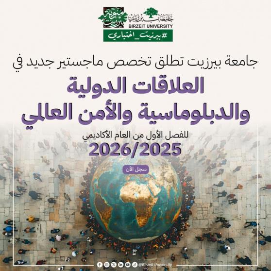 ضمن سياستها في التجديد الأكاديمي والمواكبة، أطلقت دائرة العلوم السياسية في كلية الحقوق والإدارة العامة بجامعة بيرزيت برنامج الماجستير في "العلاقات الدولية والدبلوماسية والأمن العالمي"، ليطرح على الفصل الأول من العام الأكاديمي القادم 2025-2026.