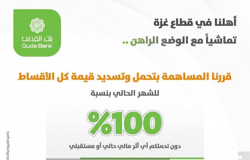 وتأتي مبادرة البنك على النحو التالي: "يتكفل بنك القدس بتسديد كامل قسط القرض المستحق عن الدفعة المحولة لراتب الشهر الحالي للعام 2025 عن الموظفين المقترضين في غزة".
