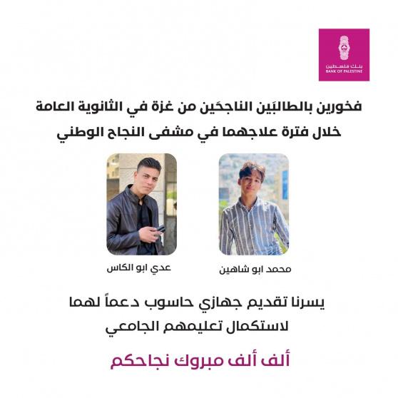 وقال البنك: "فخورين بالطالبين محمد أبو شاهين وعدي أبو الكاس الناجحين في الثانوية العامة من قطاع غزة خلال فترة علاجهما في مستشفى النجاح الوطني.. ألف ألف مبروك نجاحكم".