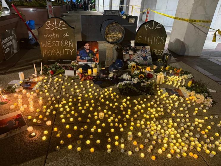نظم ناشطون وأفراد من المجتمع المحلي وكوادر صحفية، وقفة شموع أمام مقار قنوات إخبارية كبرى في العاصمة الأميركية واشنطن، شملت FOX News وNBC News وCSPAN Studio، تكريمًا للصحفيين الستة الذين استشهدوا قبل يومين جراء غارات الاحتلال على قطاع غزة.