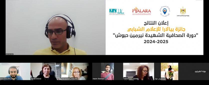 جاء ذلك خلال اجتماع افتراضي شارك فيه أعضاء لجنة التحكيم: المديرة العامة لمركز المرأة للإرشاد القانوني والاجتماعي رندة سنيورة، والمديرة العامة لـ "بيالارا" هانيا البيطار، ومدير عام التثقيف المجتمعي في وزارة شؤون المرأة نهاية الطيراوي، ومدير العلاقات العامة والإعلام في وزارة التربية والتعليم العالي/ قطاع التعليم العالي حازم شملاوي، والإعلامية والمخرجة ناهد أبو طعيمة، إلى جانب 25 من الطلبة الذين تأهلوا إلى المرحلة النهائية للجائزة.