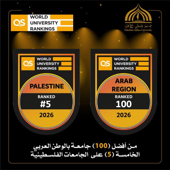 حققت جامعة فلسطين الأهلية إنجازاً أكاديمياً جديداً بدخولها تصنيف QS العالمي للجامعات لعام 2026 (QS World University Rankings 2026)، وحصولها على المرتبة الخامسة على مستوى الجامعات الفلسطينية والمرتبة المئة على مستوى الجامعات العربية، في خطوة تعكس تطور أدائها الأكاديمي والبحثي وتأكيد حضورها على الساحة التعليمية الدولية.