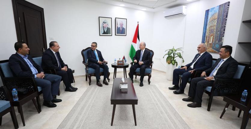 التقى رئيس الوزراء د. محمد مصطفى، اليوم الثلاثاء في مكتبه برام الله، مدير عام الشركة الأردنية الفلسطينية للتسويق الزراعي قيس القطامين، بحضور وزير الزراعة رزق سليمية رئيس الدورة الحالية للهيئة العامة للشركة الأردنية الفلسطينية للتسويق الزراعي (JPACO)، والسفير الأردني لدى فلسطين عصام البدور، ونائب المدير العام ومدير فرع الشركة في فلسطين السيد طارق أبو خيزران.