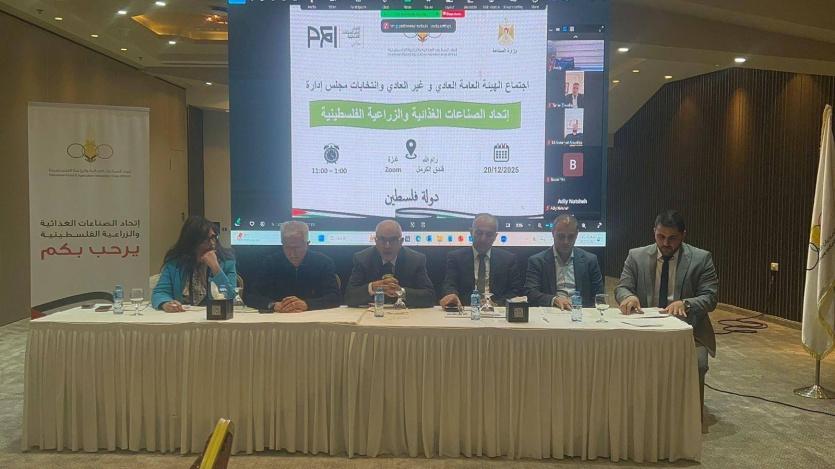 طبقا لاحكام النظام الداخلي لإتحاد الصناعات الغذائية والزراعية الفلسطينية، عقد الاتحاد يوم السبت الموافق 20/12/2025، اجتماعي الهيئة العامة العادي وغير العادي، إلى جانب انتخاب مجلس ادارة جديد للدورة العاشرة في كل من الضفة الغربية وقطاع غزة وفقا لجدول الاعمال المقرر، بحضور ممثلي وزارة الصناعة، والاتحاد العام للصناعات الفلسطينية، وشركات الصناعات الغذائية الفلسطينية الأعضاء في الهيئة العامة.