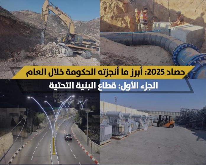 استعرض مركز الاتصال الحكومي في تقرير أصدره، اليوم الخميس، أبرز إنجازات الحكومة من مشاريع في قطاع البنية التحتية خلال عام 2025، ركزت على الحفاظ على استمرارية الخدمات الأساسية وتعزيز موثوقيتها، على الرغم من الظروف الاقتصادية والمالية الصعبة، والمتمثلة في استمرار احتجاز الاحتلال لأموال المقاصة إلى جانب الاعتداءات اليومية.