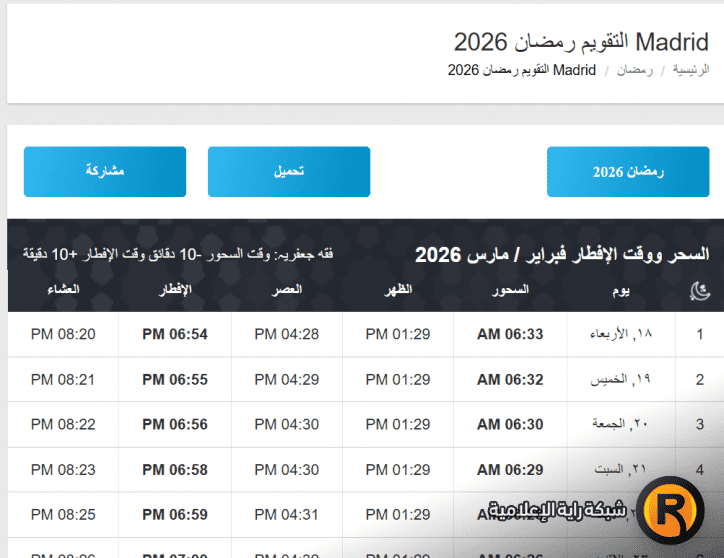 تنشر شبكة راية الإعلامية في هذا المقال على موقعها الإلكتروني، إمساكية شهر رمضان في اسبانيا للعام 2026 - 1447 حيث يحتوي على مواقيت الصلاة من الفجر والظهر والعصر والمغرب والعشاء، بالإضافة إلى وقت الإمساك والسحور.