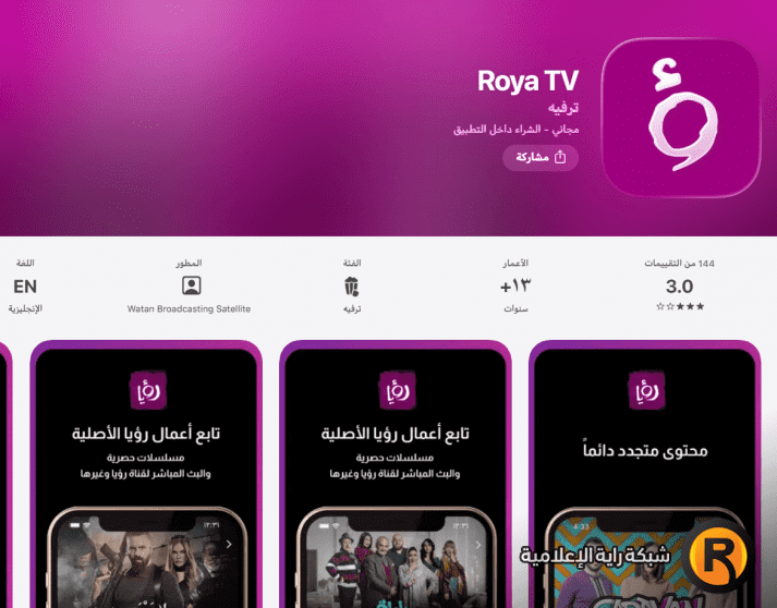 متوفر عبر App Store باسم "Roya TV" اضغط هنا
