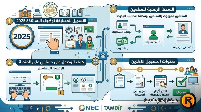 ويبحث آلاف المتقدمين عن رابط التسجيل في مسابقة الأساتذة 2025 concours onec dz، بالإضافة إلى طريقة الدخول إلى حسابي في المنصة الرقمية للأساتذة وخطوات إنشاء حساب جديد وإتمام عملية التسجيل بشكل صحيح.