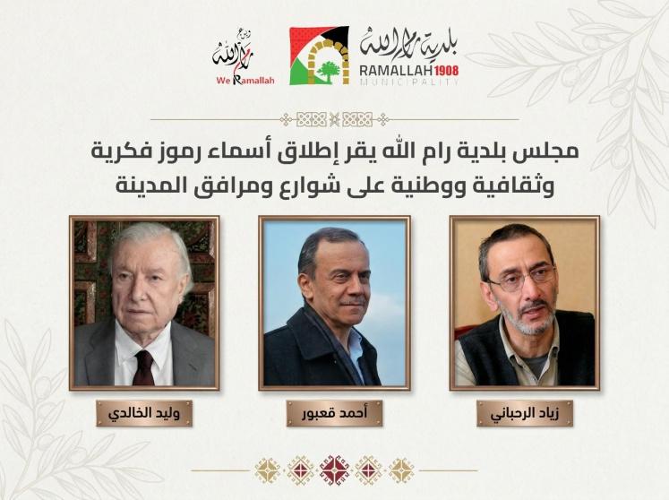 في إطار نهجها المتواصل في تكريم الرموز الفكرية والثقافية والوطنية، واستمرارا لمسيرة التسمية التي أطلقتها بلدية رام الله منذ عام 2006، قرر مجلس بلدية رام الله إطلاق أسماء ثلاث شخصيات عربية وفلسطينية بارزة على شوارع ومرافق في المدينة، تقديرا لإسهاماتهم العميقة في خدمة القضية الفلسطينية وصون الذاكرة الوطنية والثقافية.