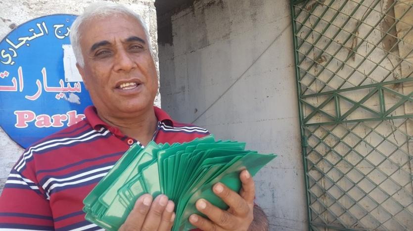 كرجل خسر تجارته كان من الممكن ان يبقى حبيس المنزل ولكنه قرر العمل في بيع بضاعة لا تحتاج الى رأس مال فوجد من الاغلفة الخضراء التي يضطر كل فلسطيني تجاوز عمره لـ 16 الى حملها للمرورعبر حاجز اسرائيلي .