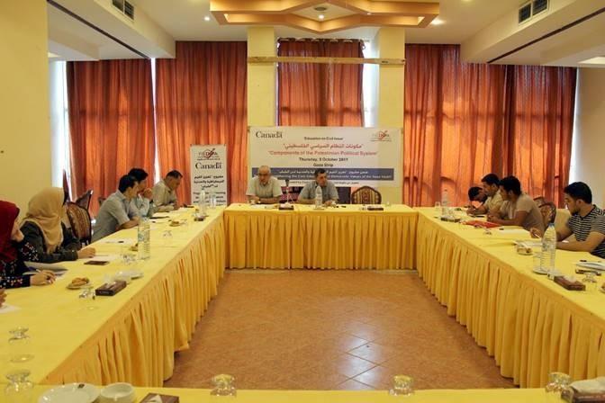 بدوره أشار الدكتور مخيمر أبو سعدة أستاذ العلوم السياسية في جامعة الأزهر، خلال المحاضرة الأولى من المشروع والتي تناولت "مكونات النظام السياسي الفلسطيني" إلي تعريف النظام السياسي الفلسطيني والاشكاليات التي يعاني منها وإلي إشكالية العلاقة ما بين السلطة والمنظمة كمكونات للنظام السياسي الفلسطيني. إضافة إلي أن النظام السياسي الفلسطيني يعاني من سلسلة أزمات من حيث النشأة والتطور، وبان البيئة القانونية تحمل في داخلها تناقض كبير من حيث تحديد الأدوار وتوزيع الصلاحيات مما أحدث تداخل في عمل المؤسسات المشكلة للنظام السياسي وأنتج الانقسام الذي يحاول الكل الفلسطيني اليوم الخروج منه.