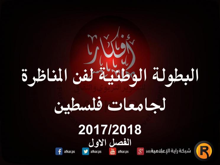 اختتمت مؤسسة افكار للتطوير التربوي والثقافي، الفعاليات النهائية للبطولة الوطنية لفن المناظرة لجامعات فلسطين 2017\2018 الفصل الاول، وذلك بالتعاون مع الجامعات الفلسطينية وبدعم من الصندوق الوطني للديمقراطية، وقد استضافت جامعة القدس هذه الفعاليات، حيث تنافس 18 طالب/ة يمثلون جامعات "النجاح الوطنية، بيرزيت، الخليل، بيت لحم، القدس، العربية الامريكية".