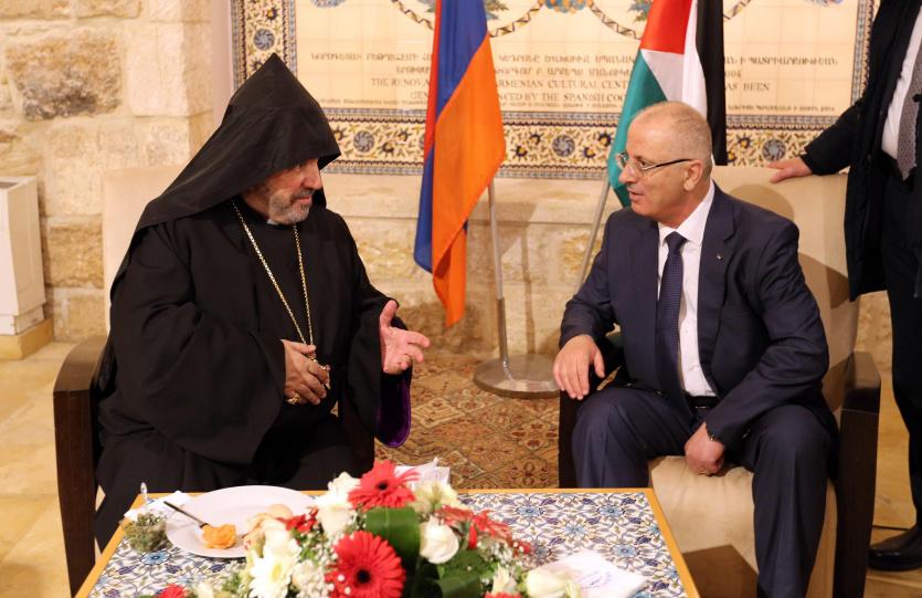 واردف الحمد الله: "نيابة عن فخامة الرئيس محمود عباس وباسم شعبنا الفلسطيني، أهنئ كهنة وأبناء الكنيسة الأرمنية في فلسطين، وفي كافة أصقاع العالم بالأعياد المجيدة، وأتمنى أن يعيدها الله وقد تحررت بلادنا من براثن الاحتلال الإسرائيلي الظالم، وتكرس الأمن والسلام في مدينة السلام ولشعوب الأرض قاطبة".