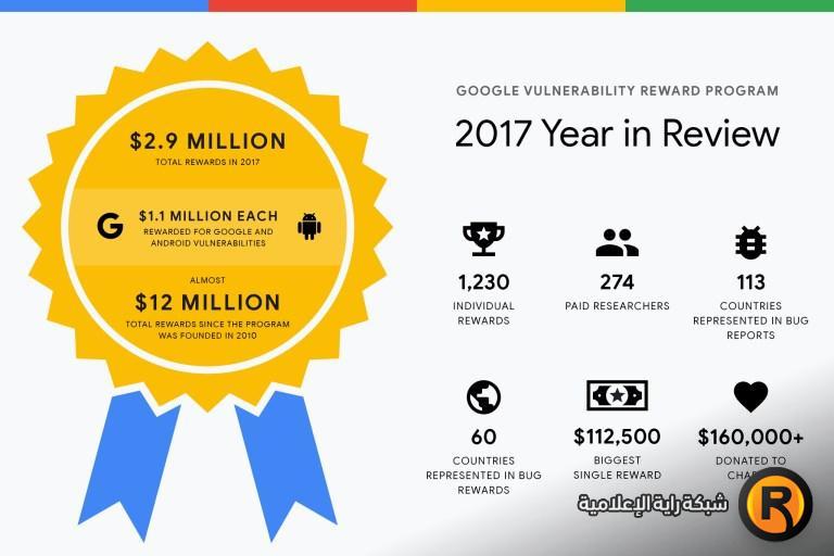 خلال سبعة أعوام وضمن برنامج جوجل لمكافآت الثغرات الأمنية، دفعت الشركة 12 مليون دولار، في العام الماضي وحده دفعت 2.9 مليون دولار وفي العام 2016 دفعت 3 مليون دولار.