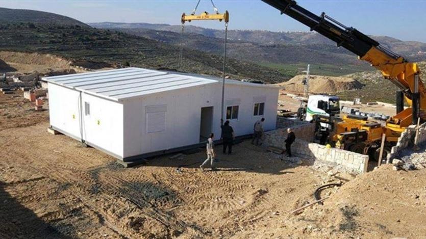 ووضع المستوطنون، أول منزل في المستوطنة، بالتزامن مع وصول شاحنات تحمل عددا من البيوت المتنقلة.