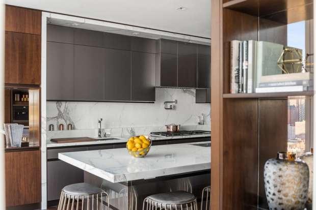وتجاور طاولة الطعام المزودة بسطح معد من الزجاج الشفاف، النوافذ الكاشفة على ناطحات السحاب، وتحوط الطاولة كراس مبطنة بالقماش الرمادي الفاتح، وتتدلى من السقف ثريا عصرية لافتة.